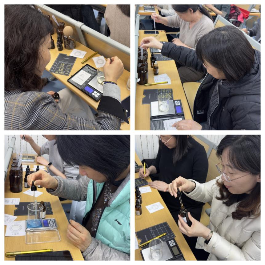 在实践环节,老师们在专业调香师的指导下,化身“生活艺术家”,亲自动手体验香水调配的乐趣。大家根据自己的喜好,将不同的香基原料按照比例混合,辅以增溶剂、定香剂等溶剂,最终调制出独一无二的专属香水。活动现场欢声笑语不断,大家互相交流调香心得,分享各自的创作灵感。
