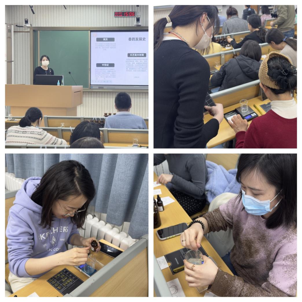 活动现场香气四溢,气氛轻松愉悦。活动特邀专业调香师担任主讲嘉宾,为到场老师们讲解了香水的起源、发展历史、香调分类以及如何根据个人气质和场合选择合适的香水等专业知识。