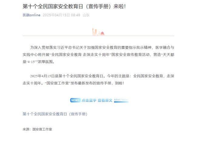 谋划制定国家安全教育宣传方案,精选国家安全宣传素材,依托中心官方公众号“医融online”规划开展多期国家安全主题宣传推文,将维护国家安全融入中心“大安全”宣传格局,同学生安全、意识形态安全、交通安全、实验室安全、学术诚信等共同宣传落实。
