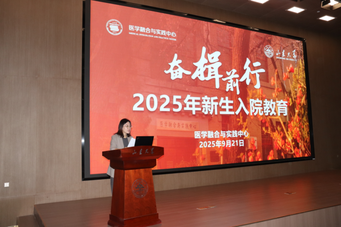 王伟主任在致辞中介绍了山东大学、齐鲁医学院和医学融合与实践中心的校史院情和改革发展成就。她指出,当前是学校全面图强三年行动方案深入实施、重点改革落地见效的开局起步期,新同学们作为学校改革发展的青春新动能,要进一步学习领会学校第十五次党代会精神和“一五七九”发展思路,努力成长为堪当大任的新时代山大人。她通过分享侯宝璋、孙鸿泉、苏应宽等齐鲁医学先贤事迹勉励2025级全体新生:一是要立报国之志,勇担时代使命,把个人的理想追求融入党和国家的卫生健康事业之中。二是要怀济世之心,涵养高尚医德,在日常规培科研中践行“敬佑生命、救死扶伤、甘于奉献、大爱无疆,全心全意为人民健康服务”的崇高职业精神。三是要守学术之诚,坚持潜心治学,以“一辈子办成一件事”的执着行稳致远走好未来科研路,在砥砺创新中成就精彩人生。